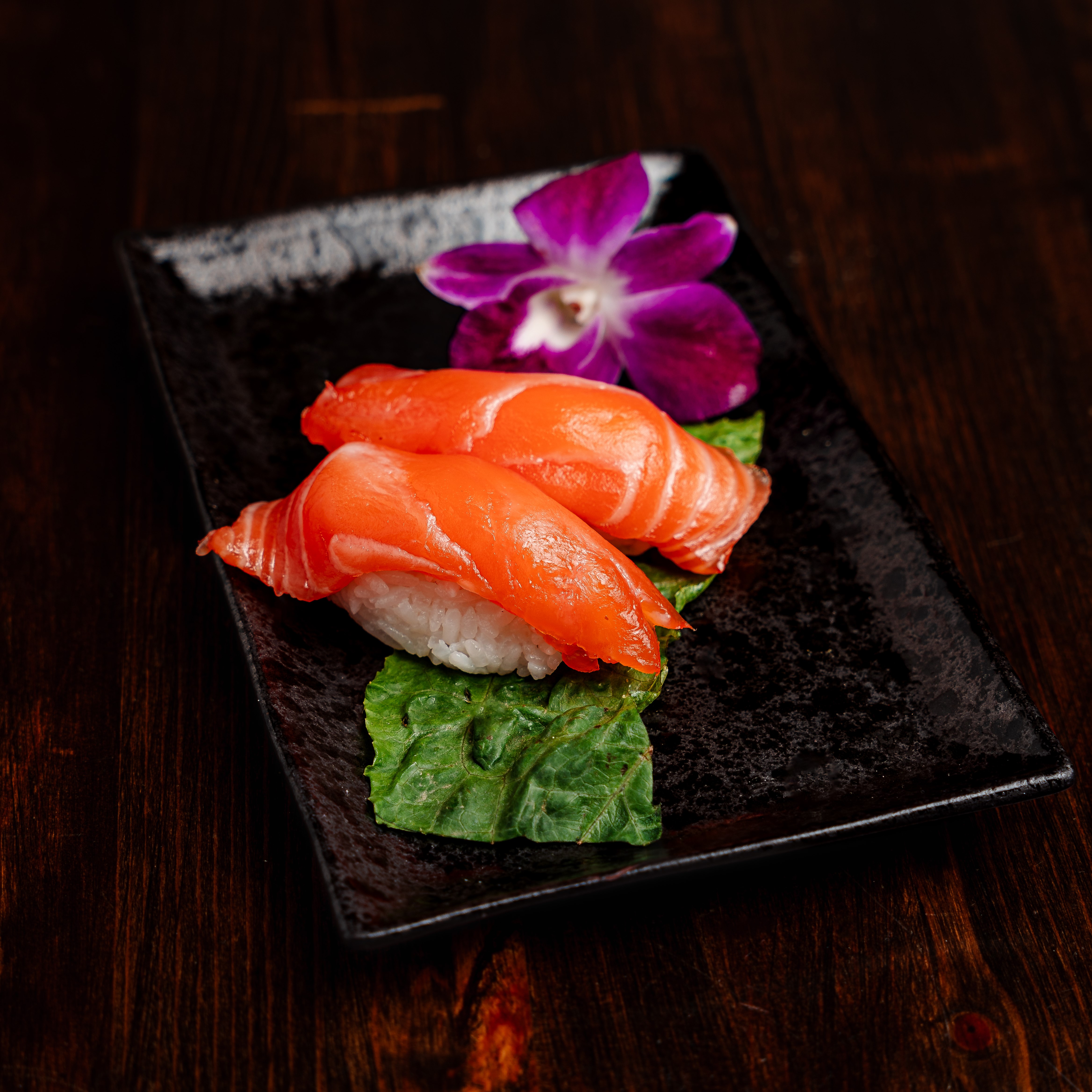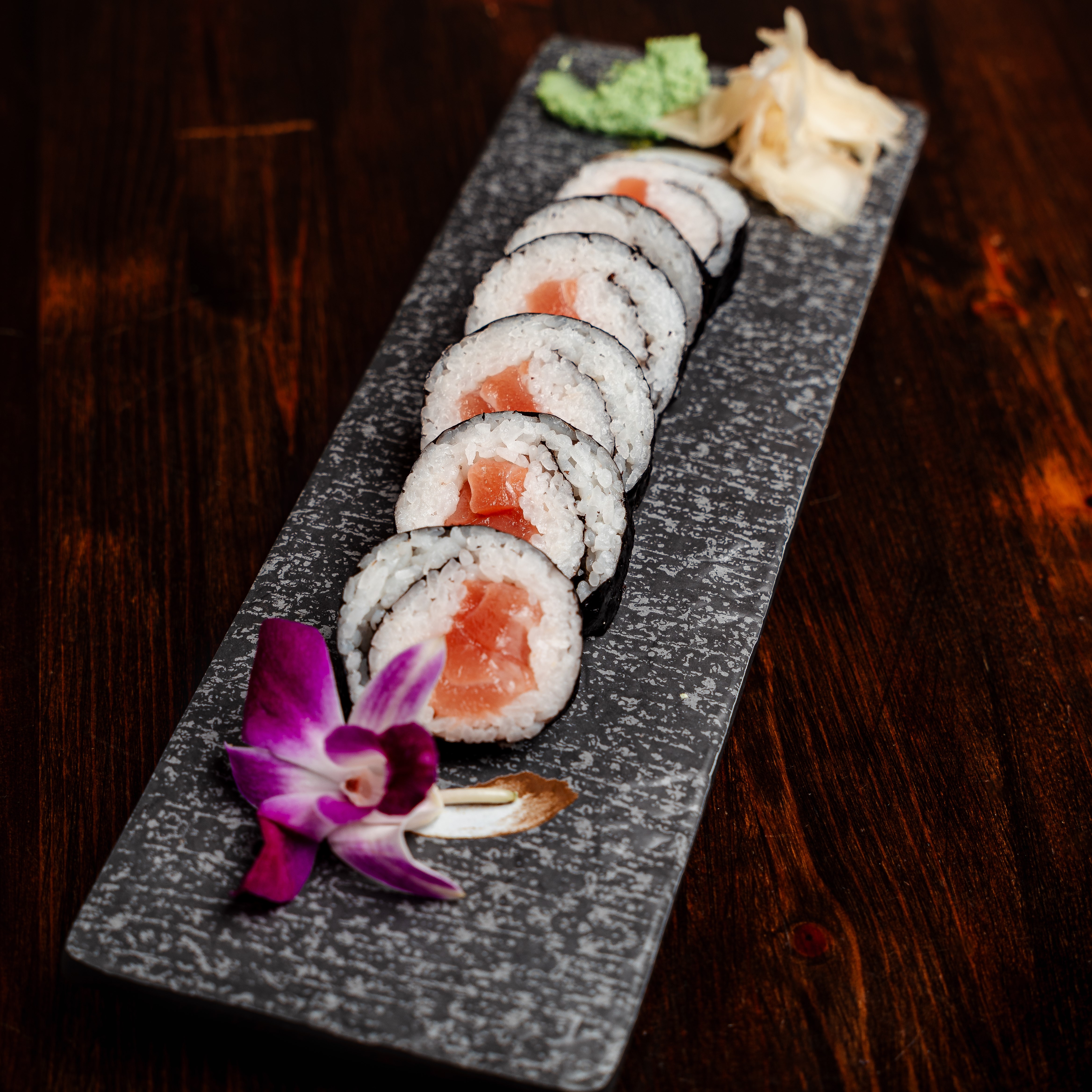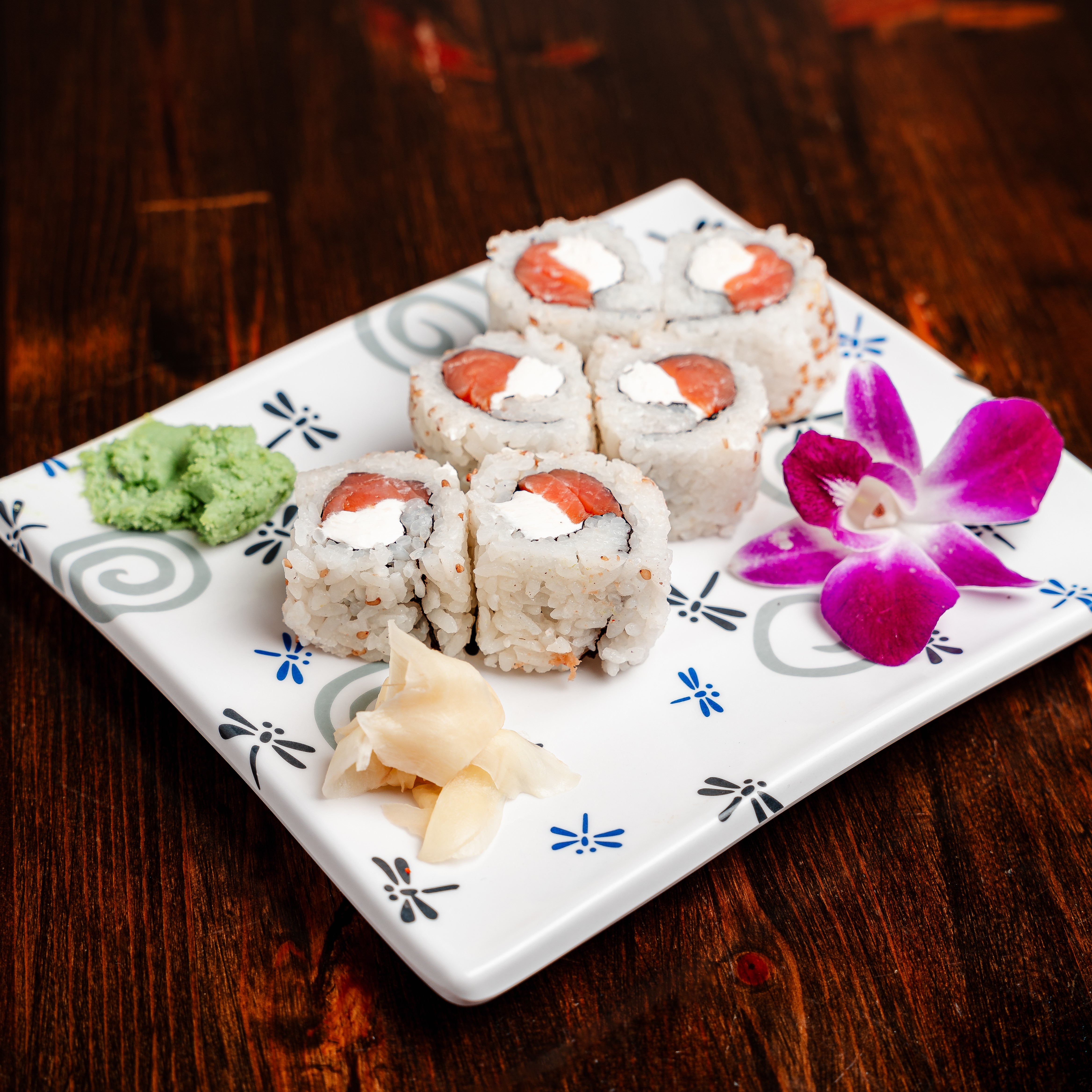 Shrimp tempura, avocado, and cream cheese inside. Topped with seared peppered salmon, eel sauce, and green onions.