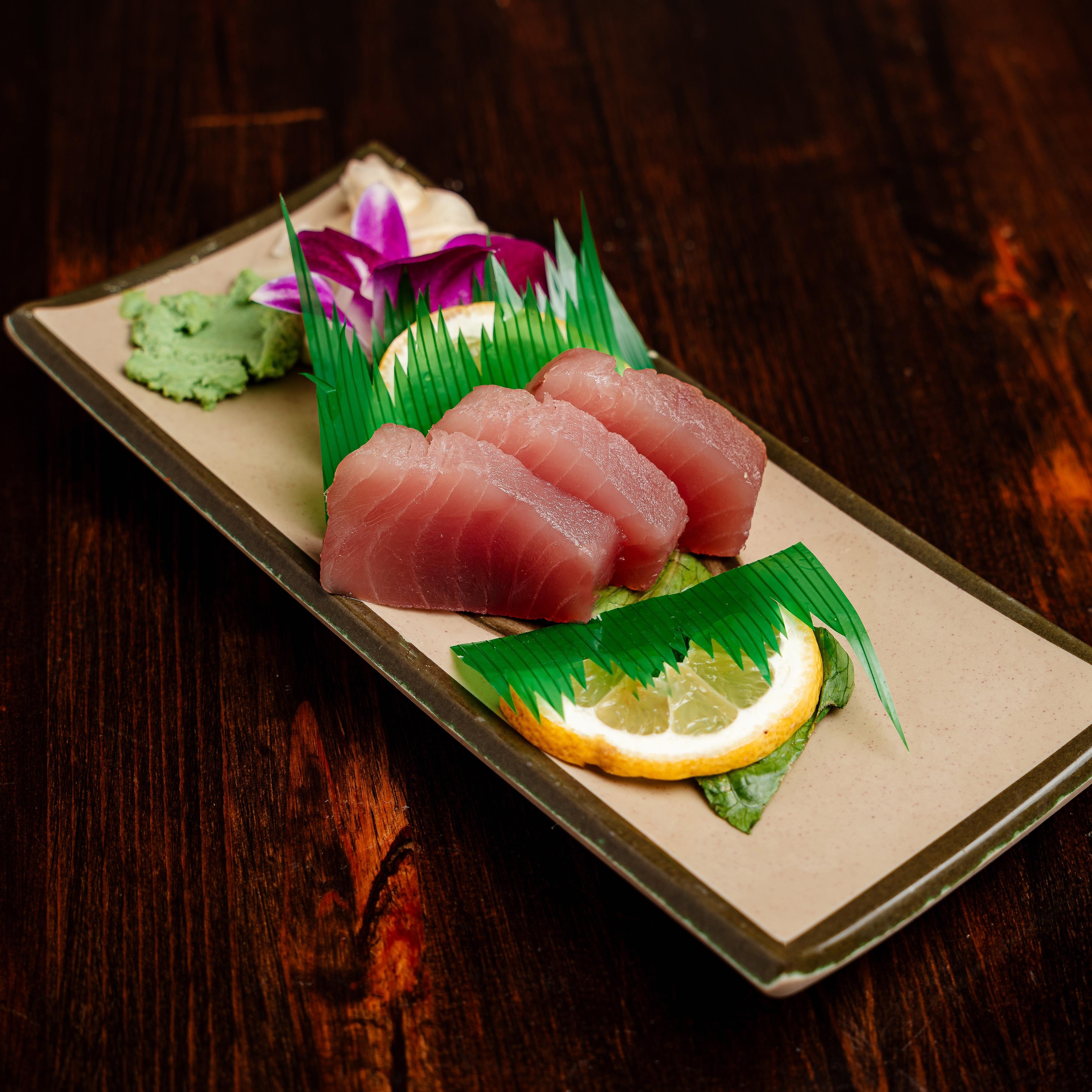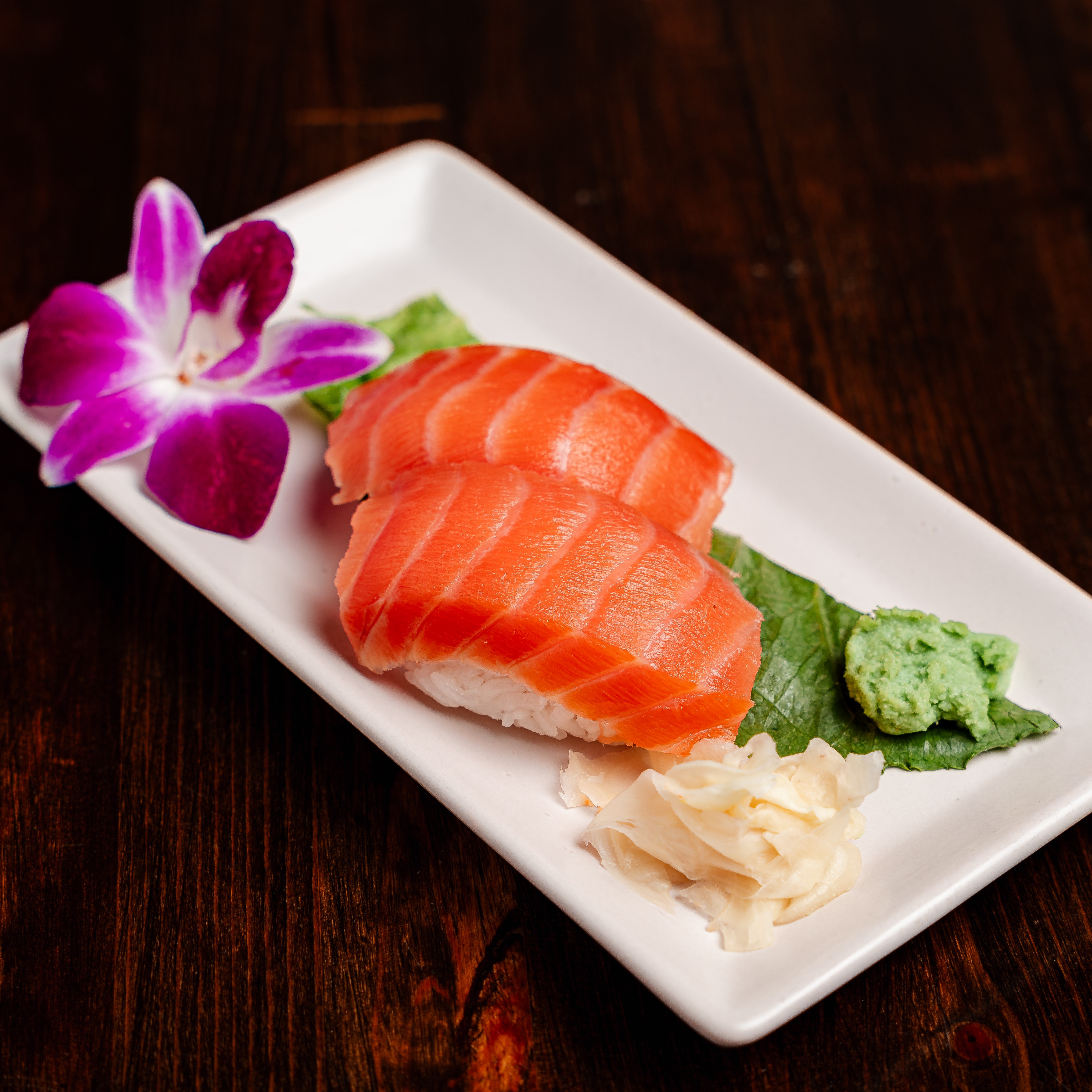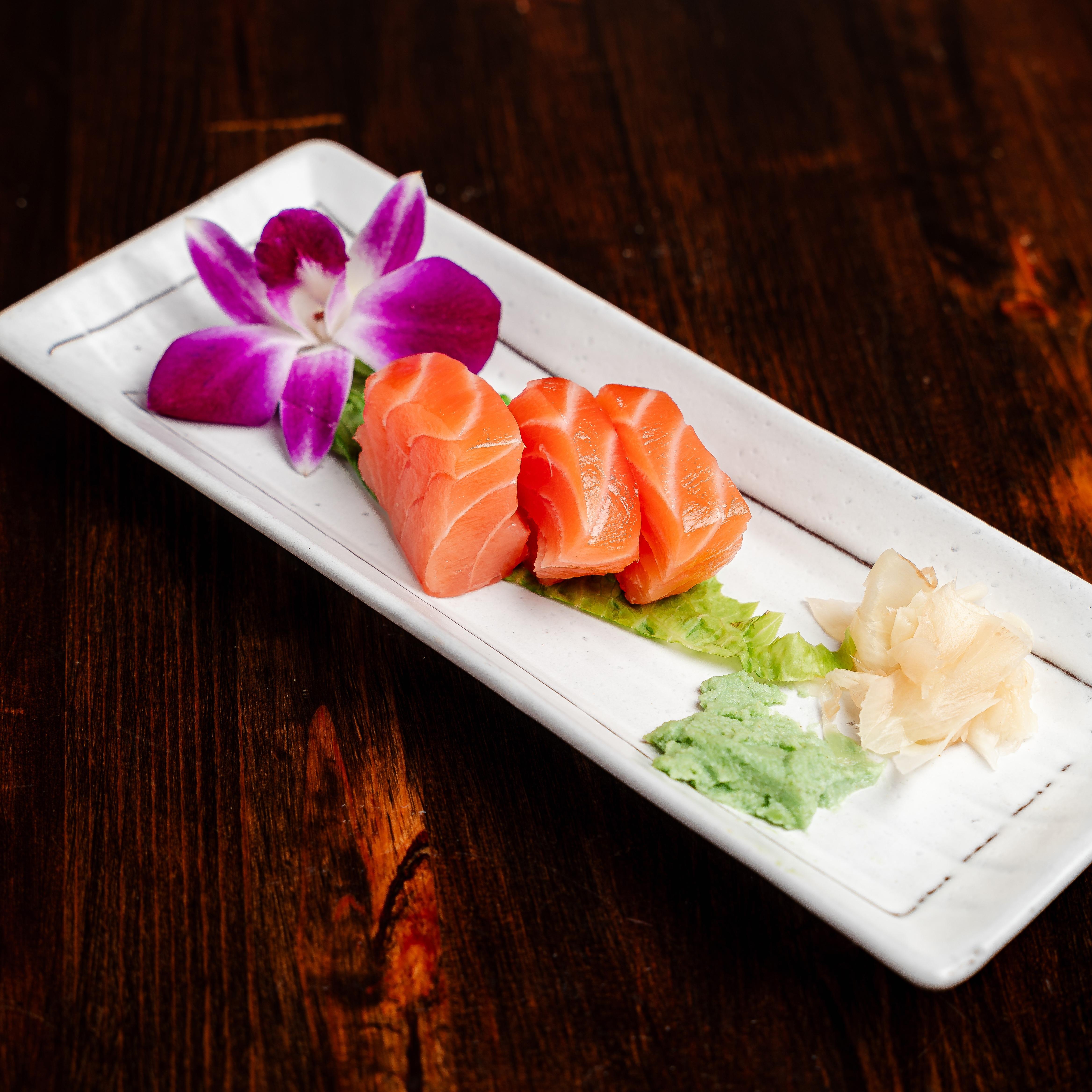 Shrimp tempura, avocado, and cream cheese inside. Topped with seared peppered salmon, eel sauce, and green onions.