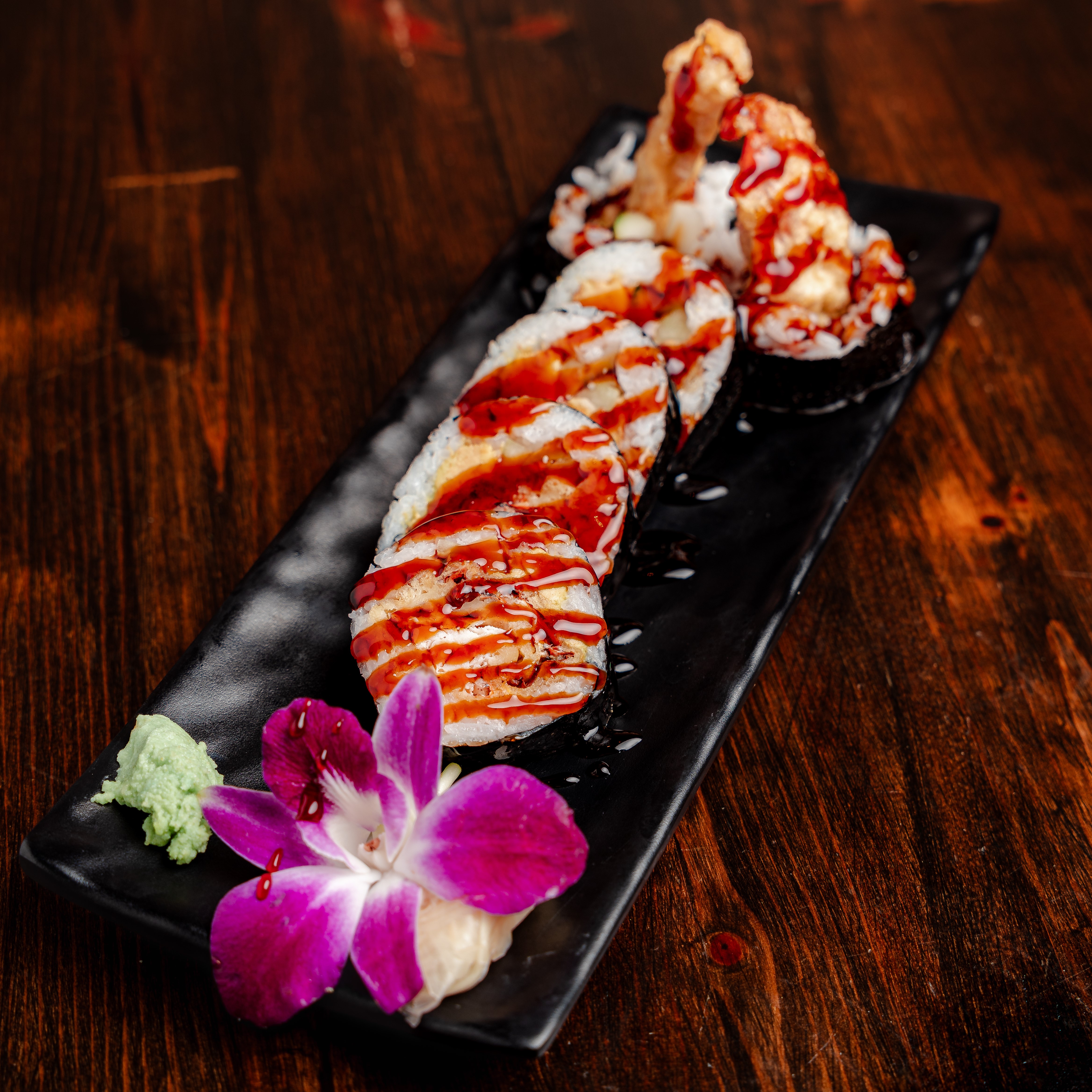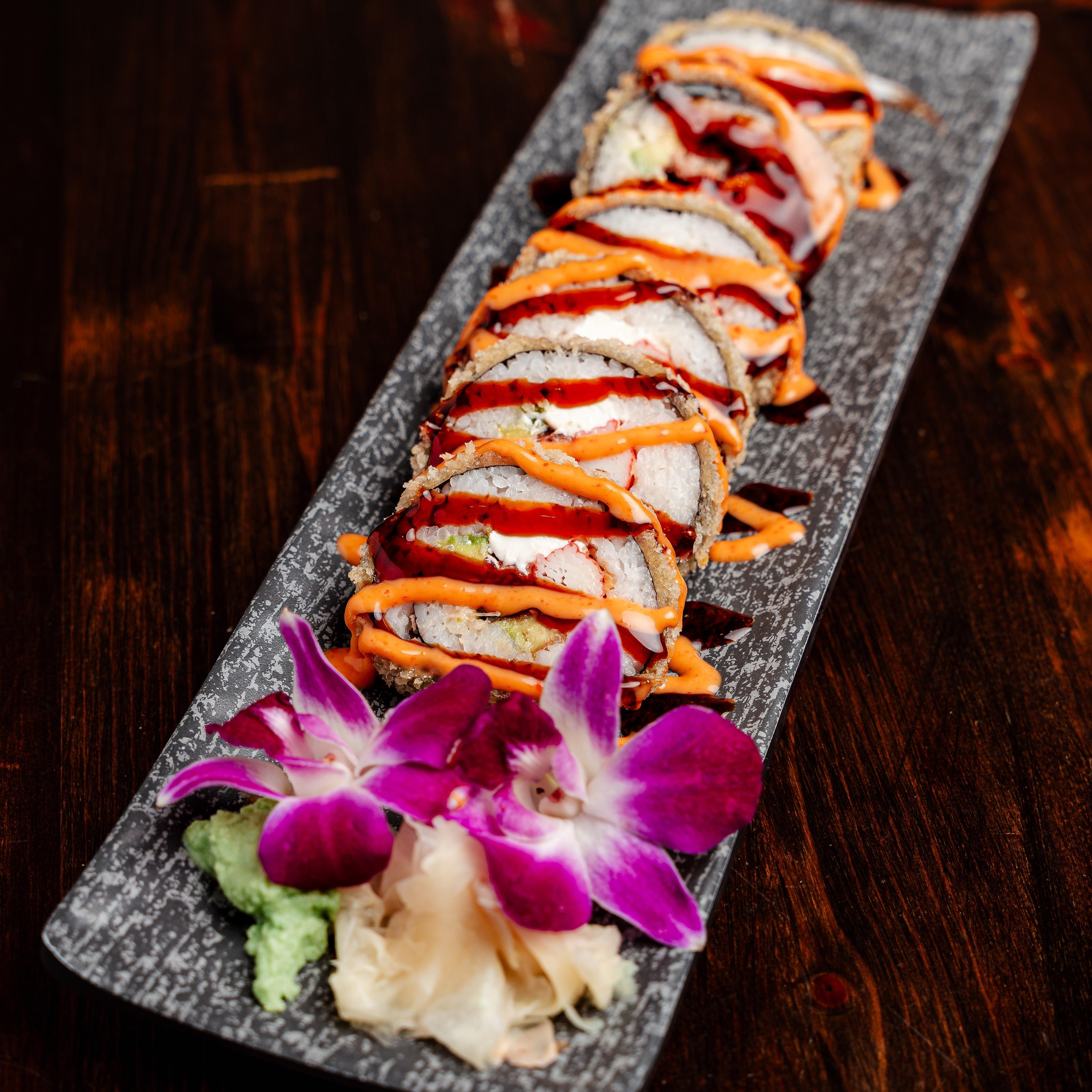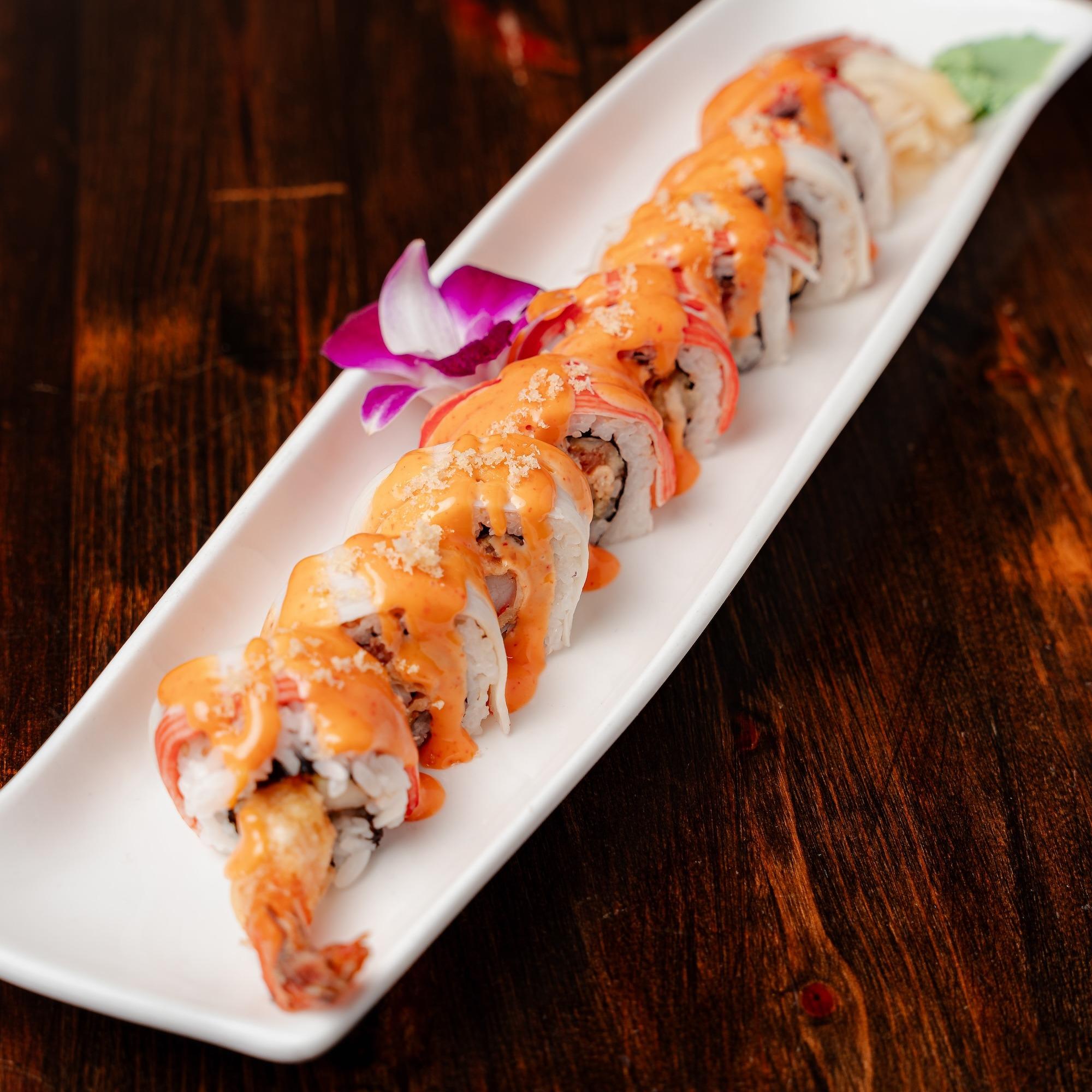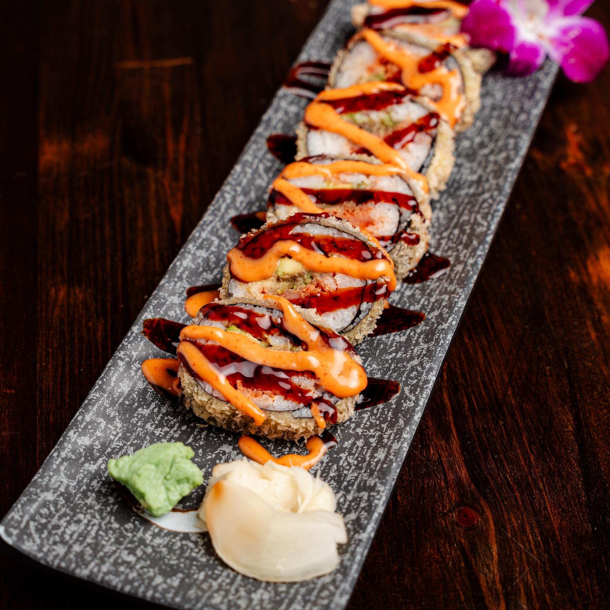 Shrimp tempura and spicy crab are inside the roll. Topped with avocado, sliced jalapeño, eel sauce, and spicy sauce.