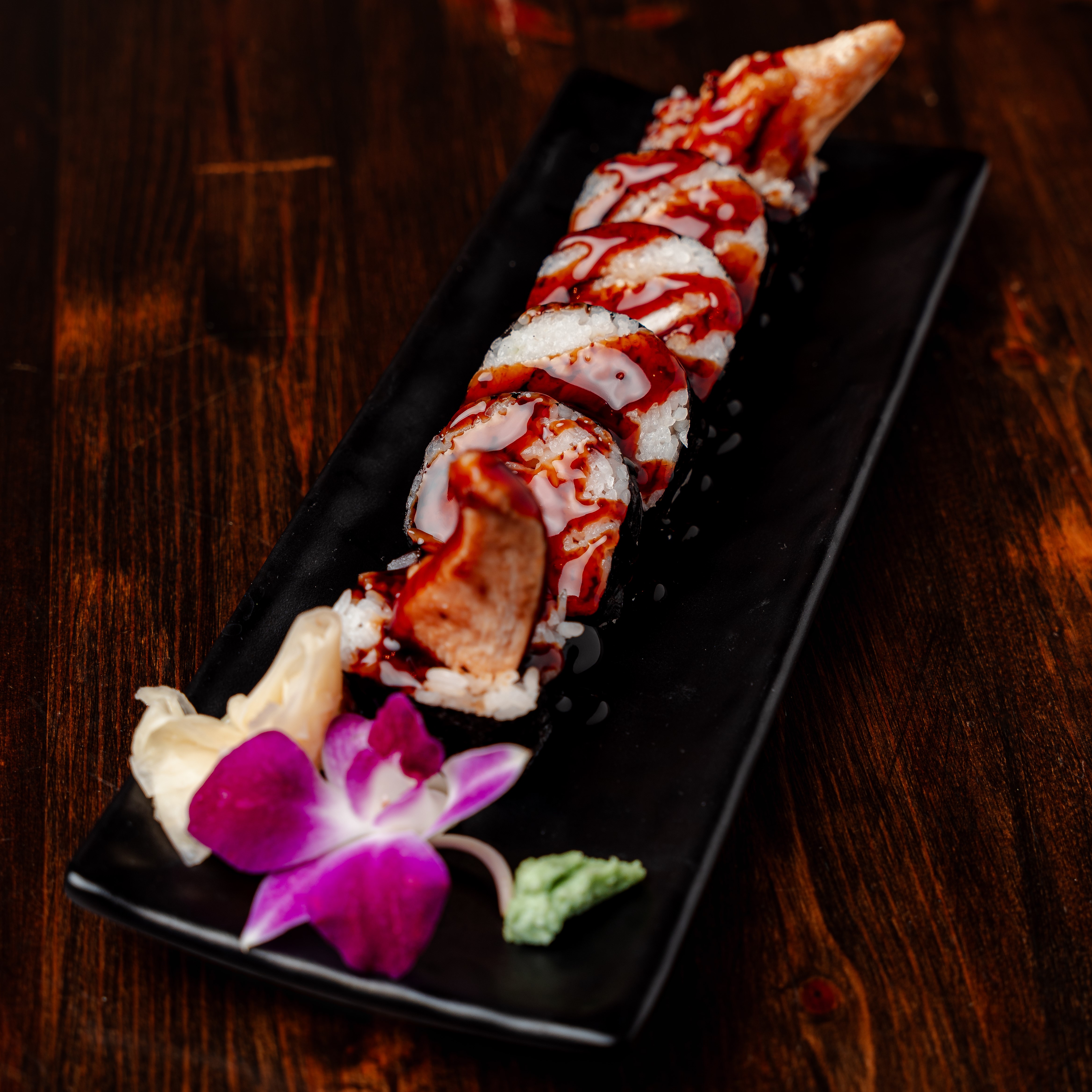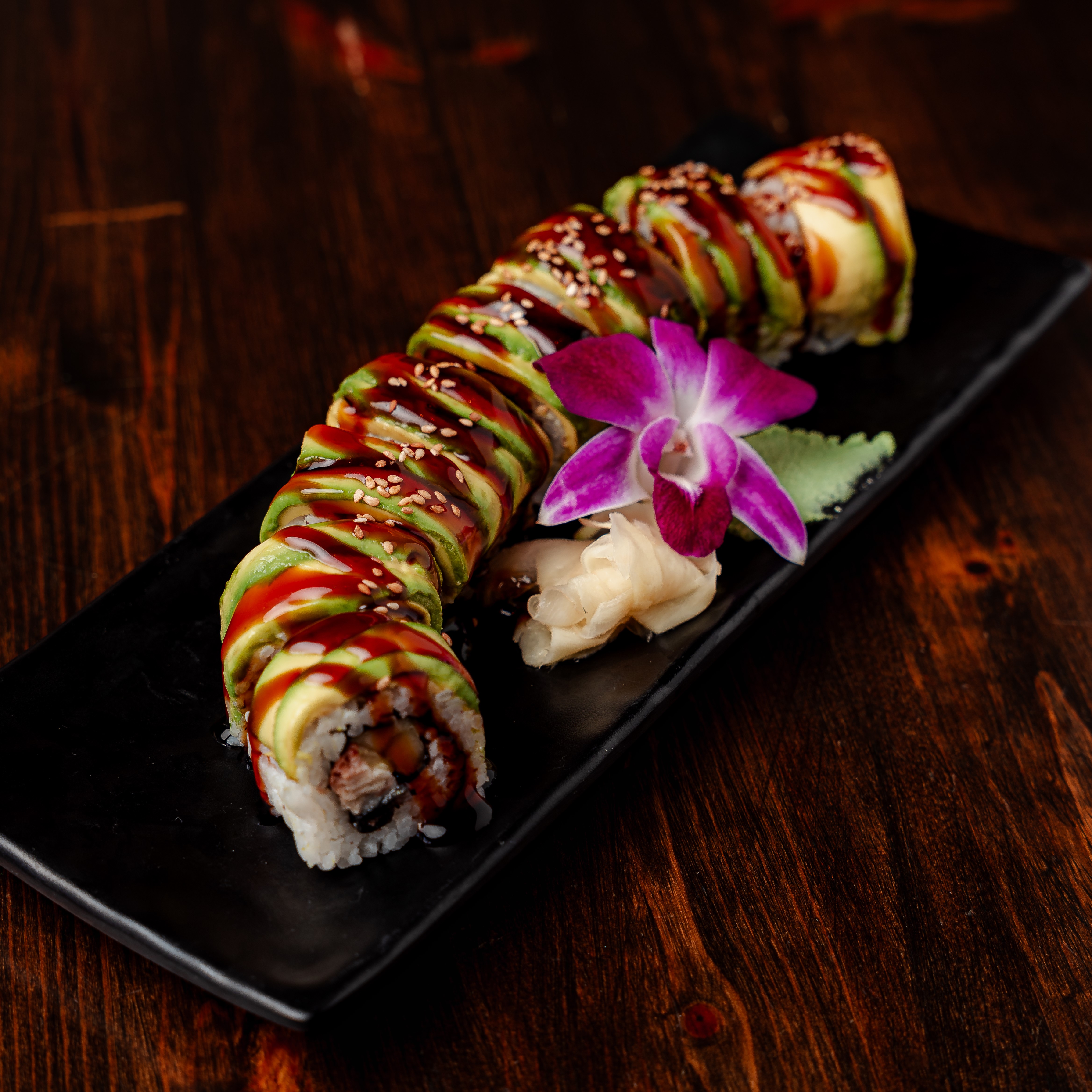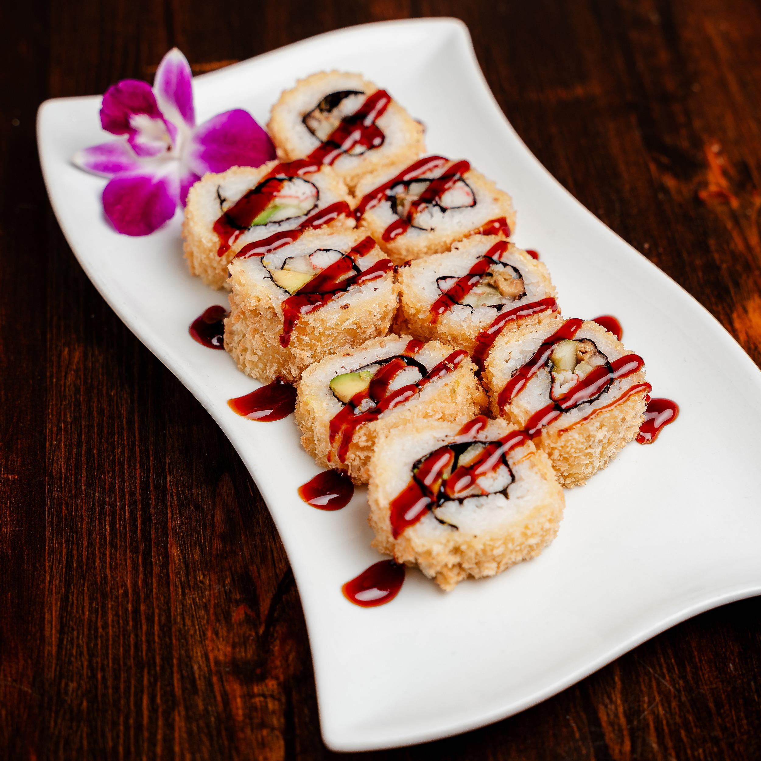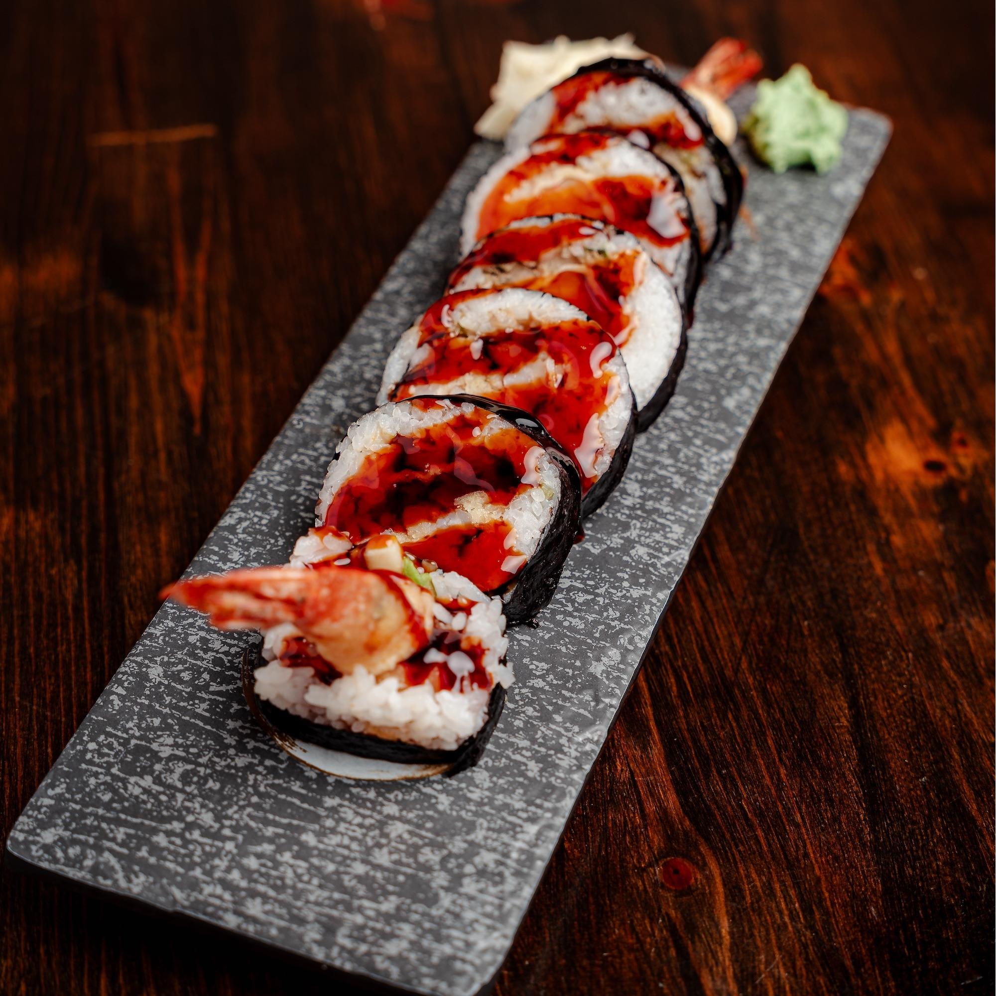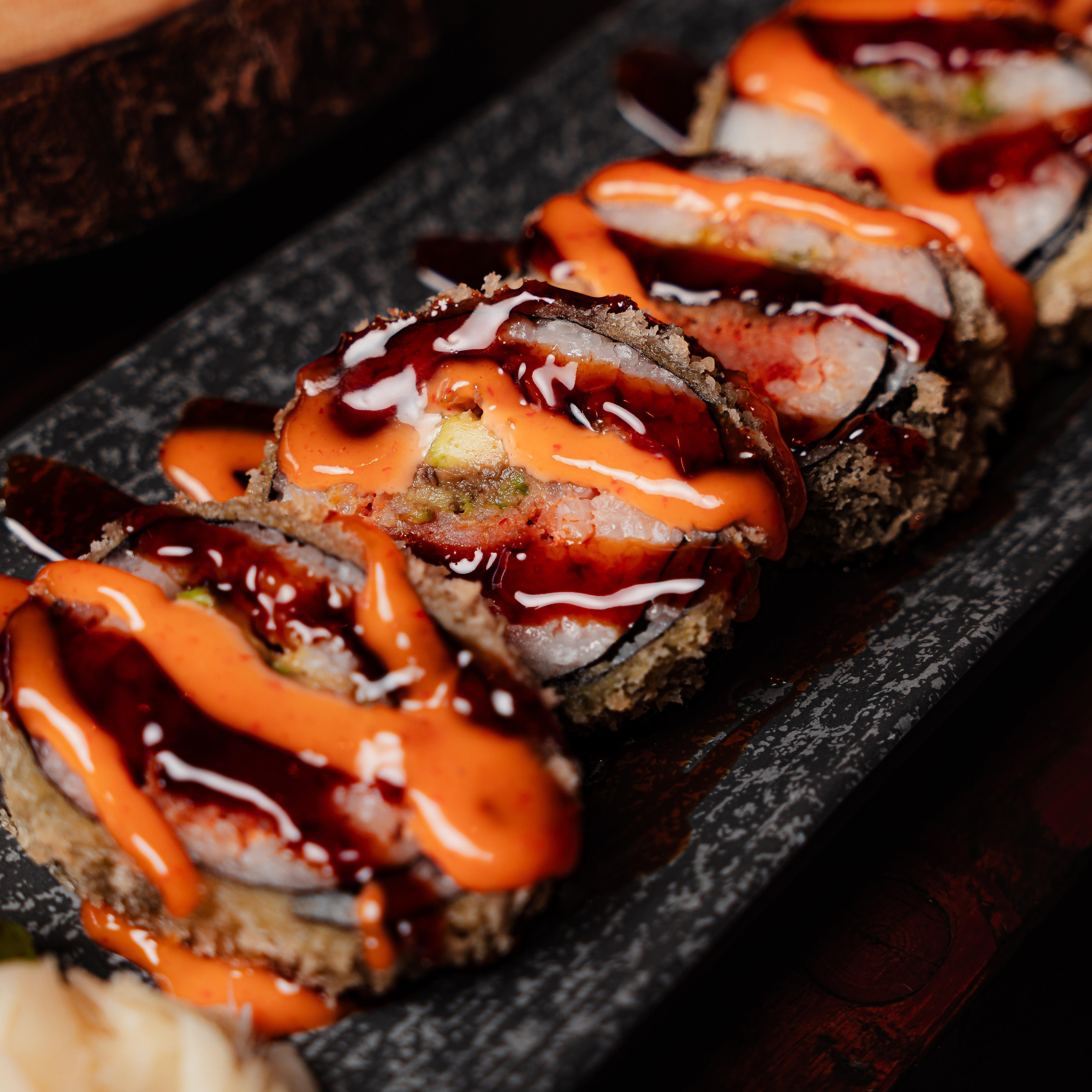 Shrimp tempura and spicy crab are inside the roll. Topped with avocado, sliced jalapeño, eel sauce, and spicy sauce.