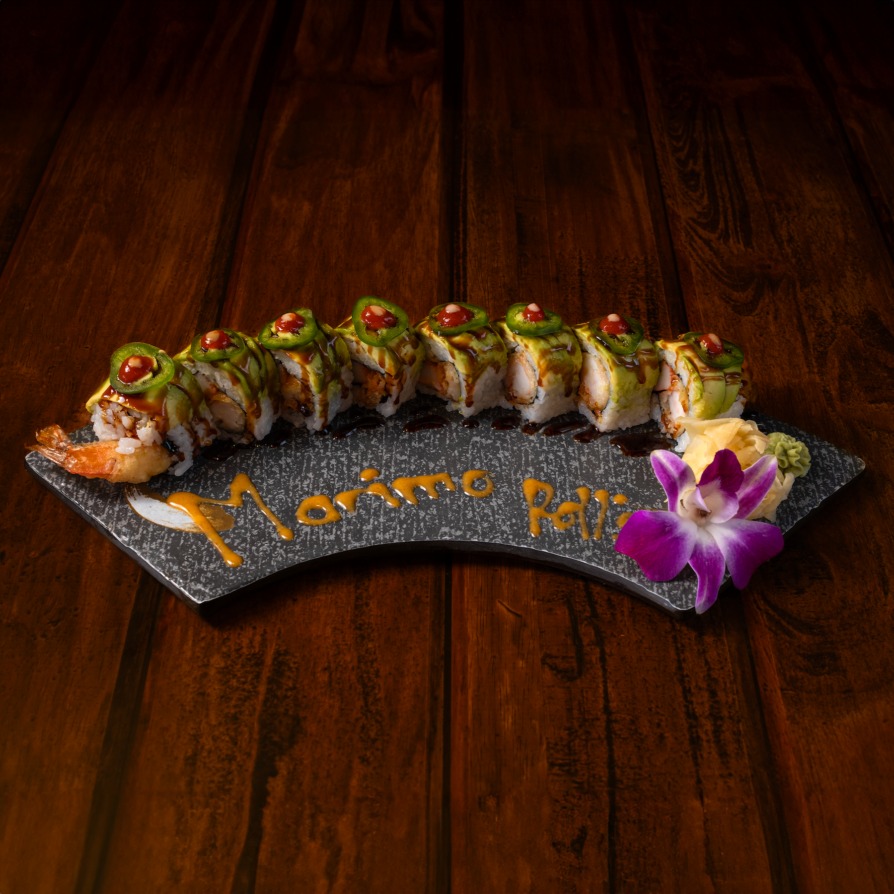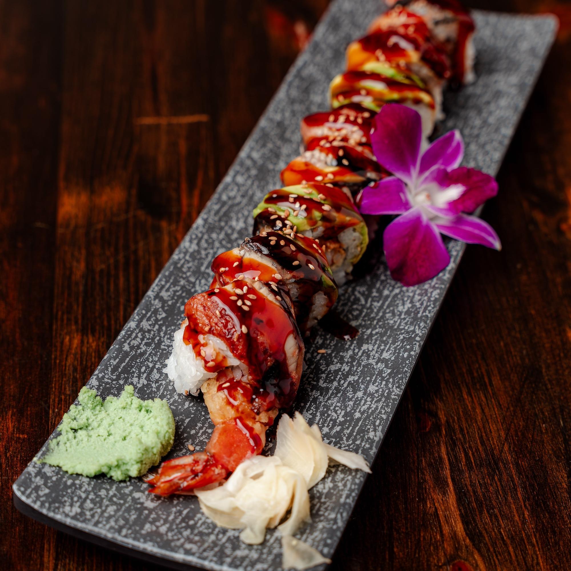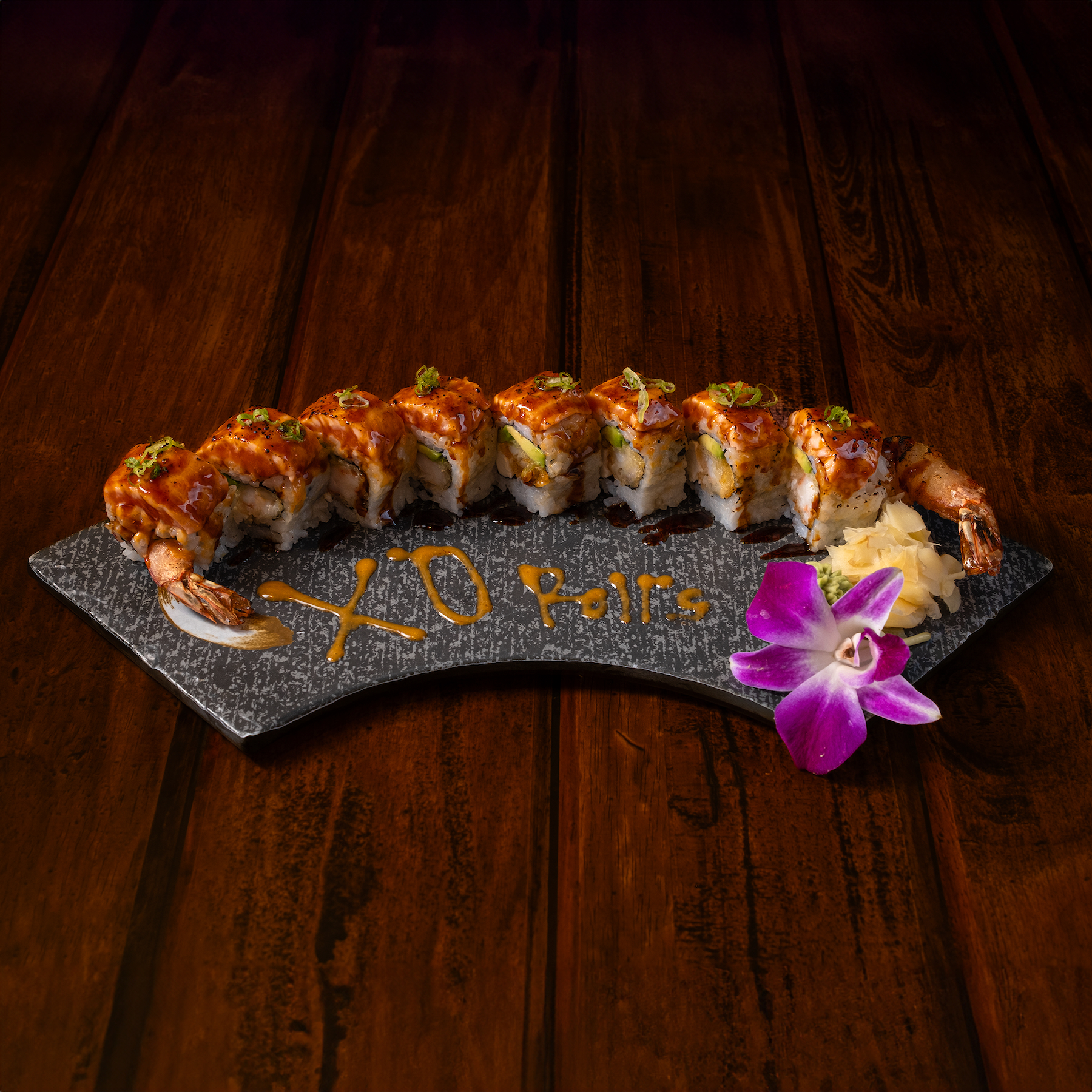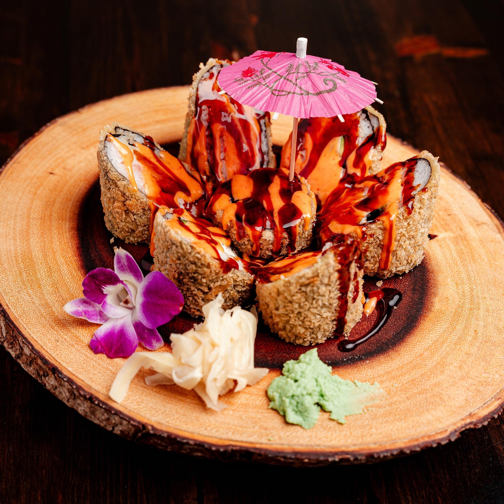 Shrimp tempura and spicy crab are inside the roll. Topped with avocado, sliced jalapeño, eel sauce, and spicy sauce.