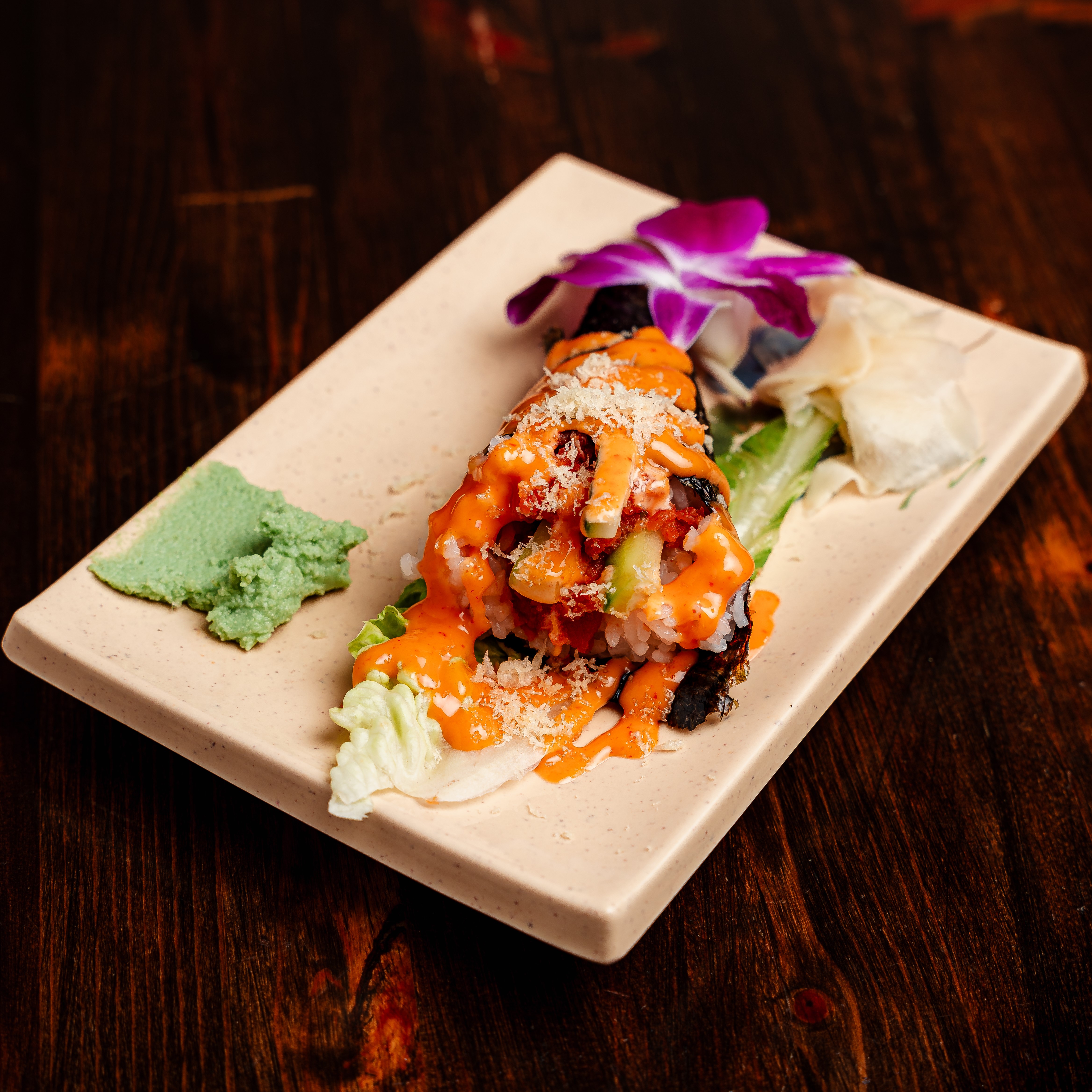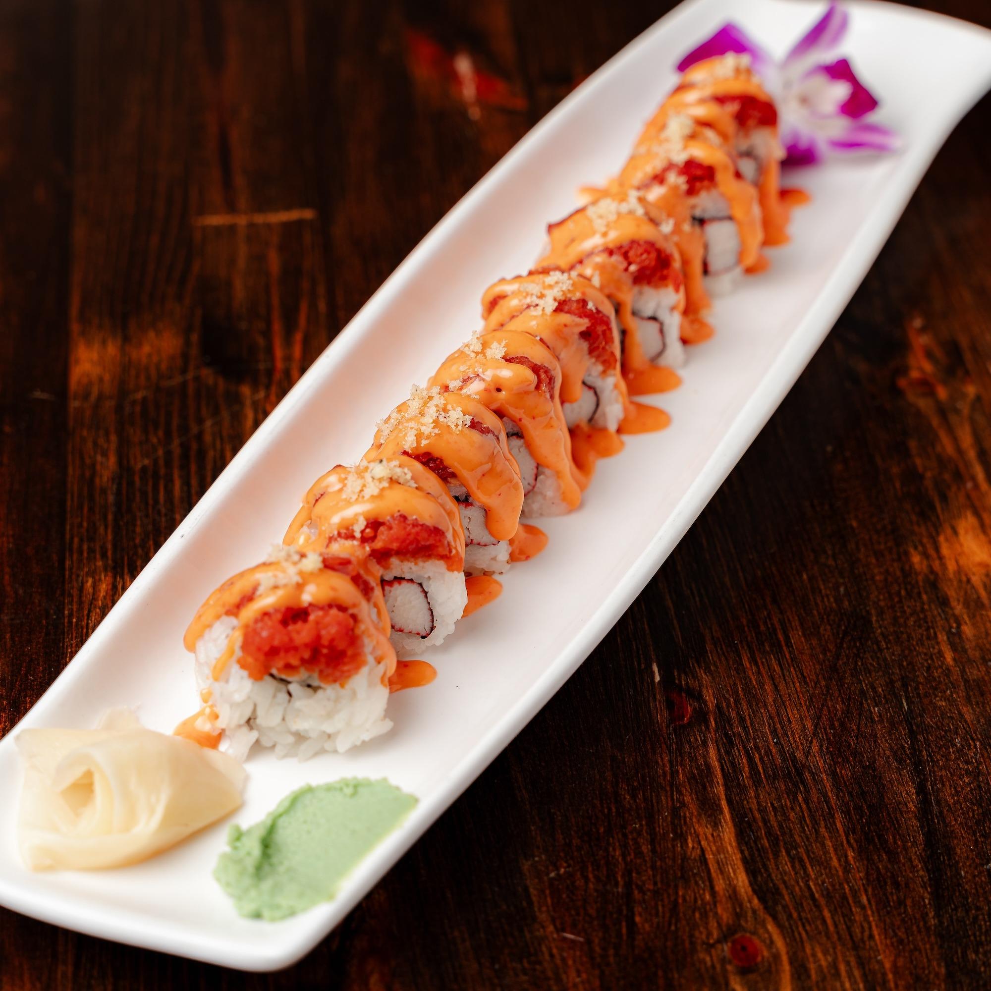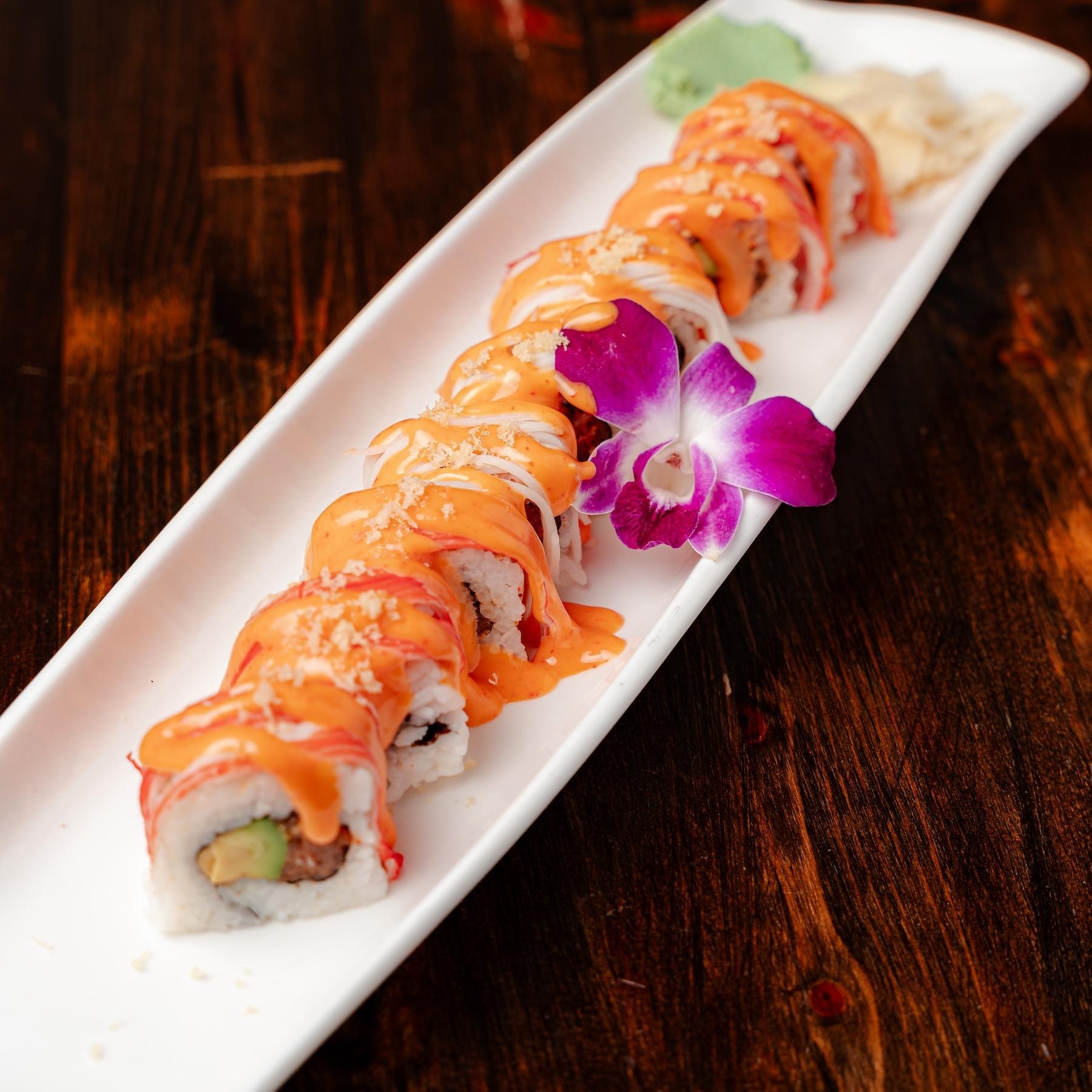 Topped with spicy crab, spicy mayo, and crunch. Inside, Avocado and spicy tuna.