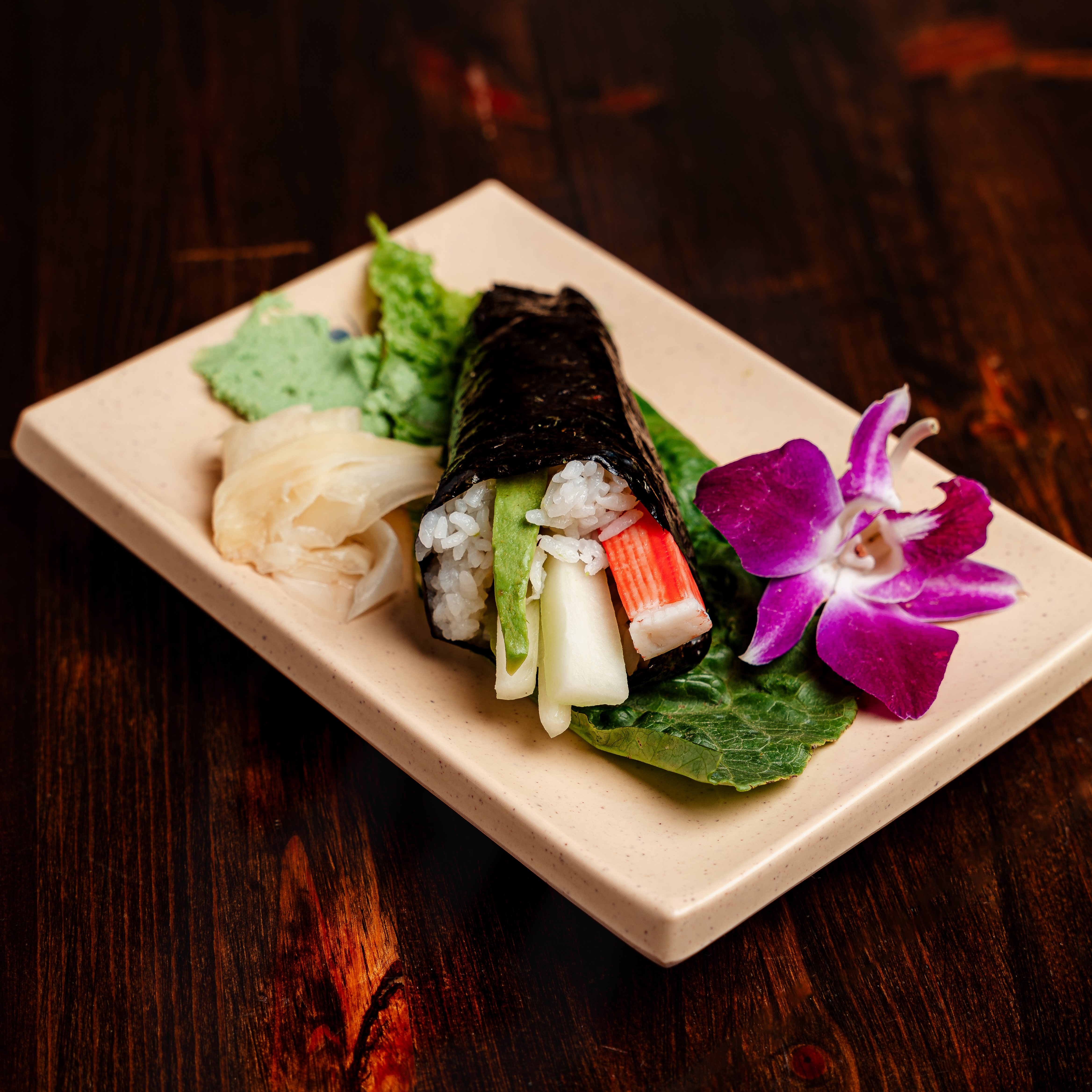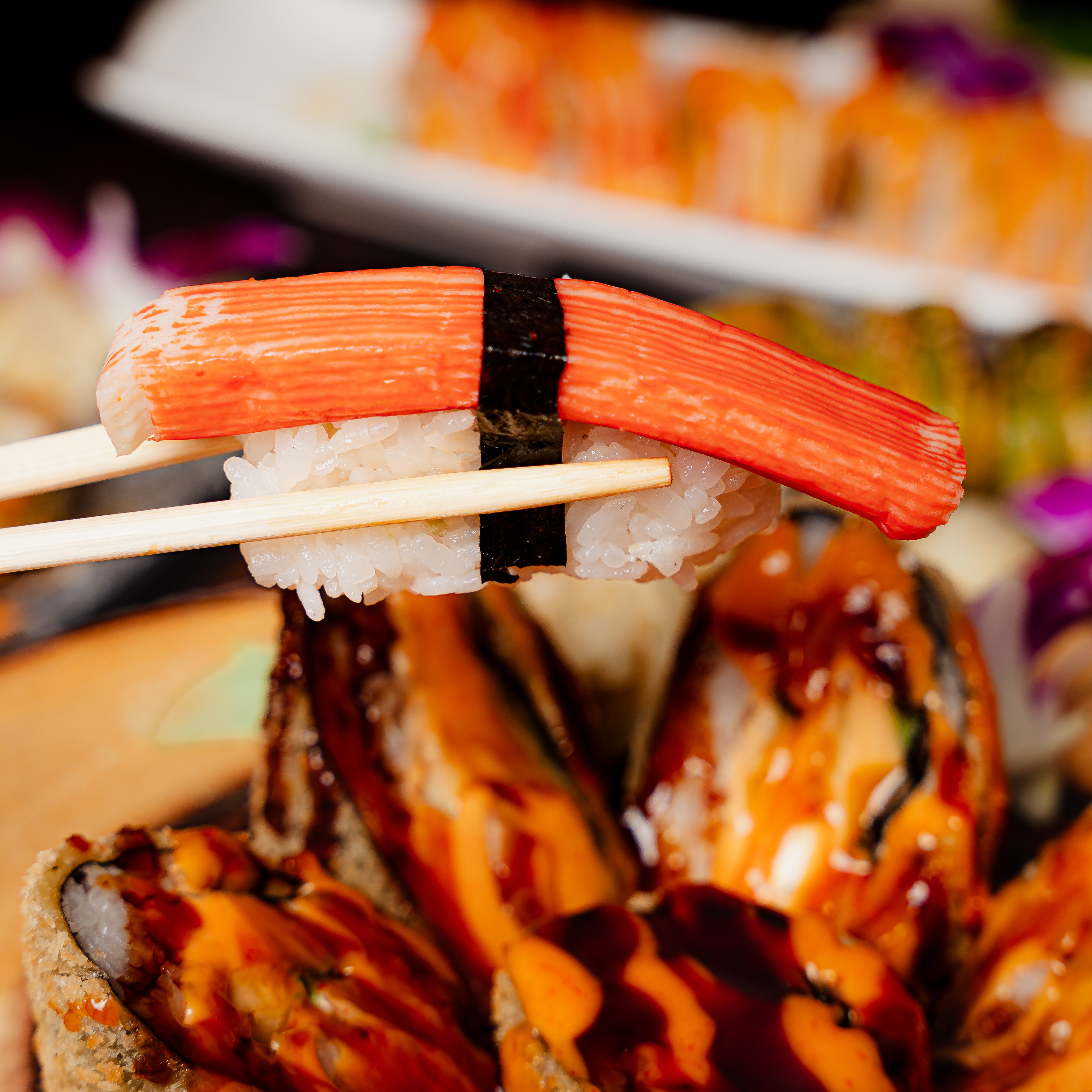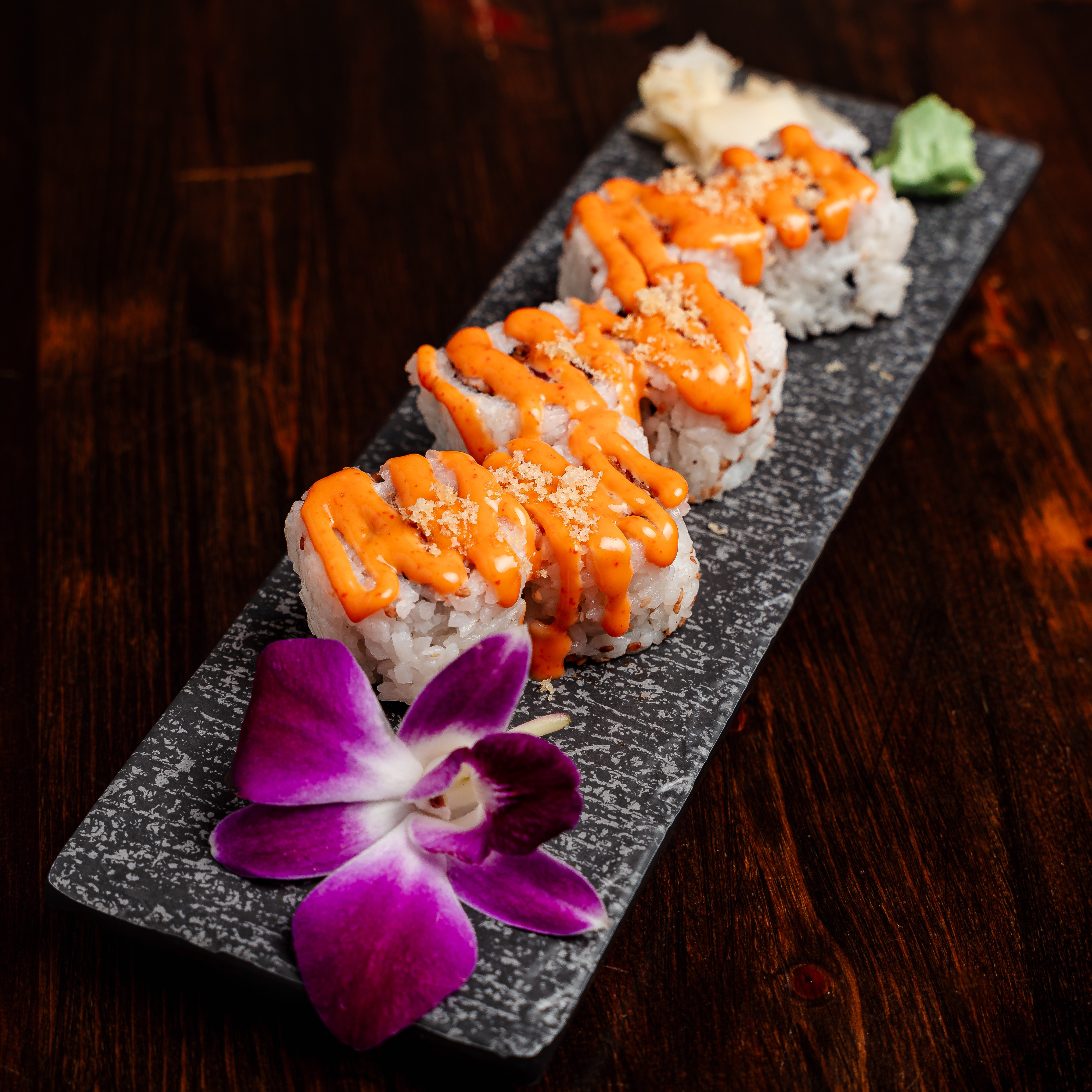 Topped with spicy crab, spicy mayo, and crunch. Inside, Avocado and spicy tuna.