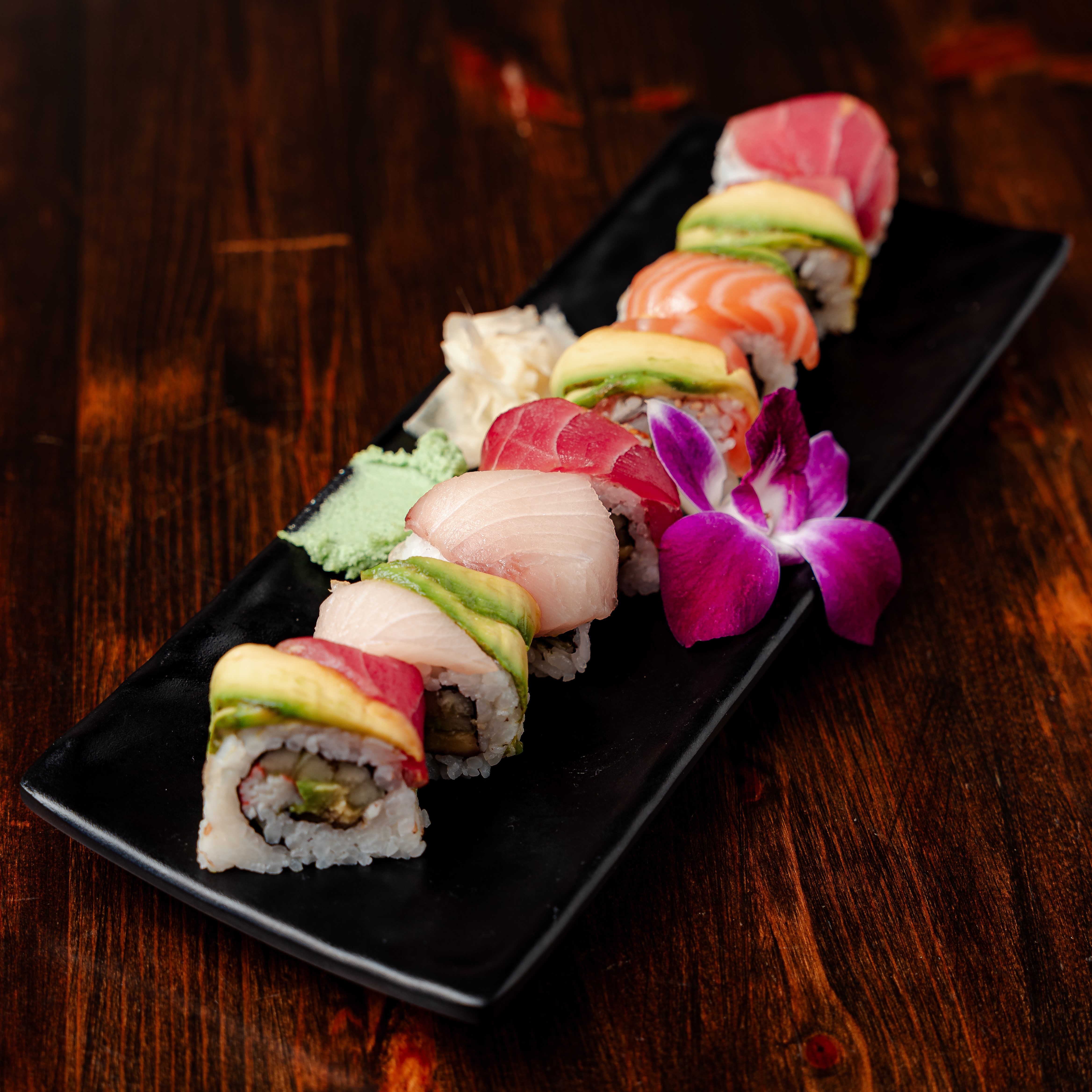 Crab, avocado, and cucumber topped with tuna, salmon, and avocado.