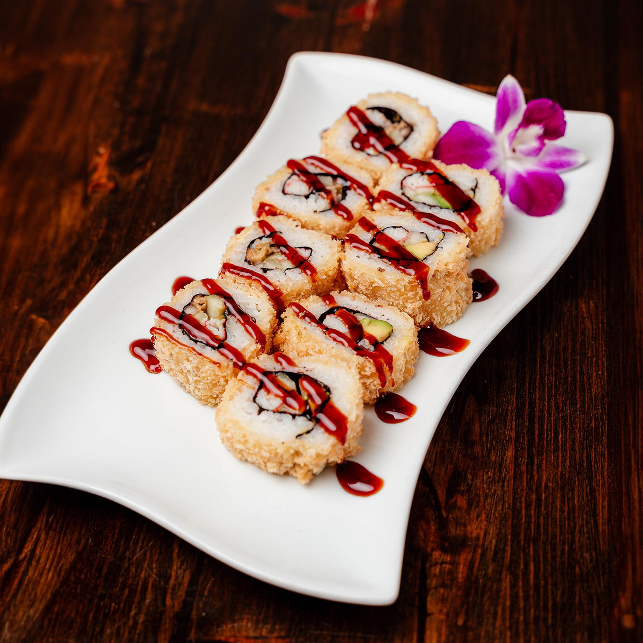 Deep Fried Soft Shell Crab, Cucumber, Avocado topped with Eel Sauce.