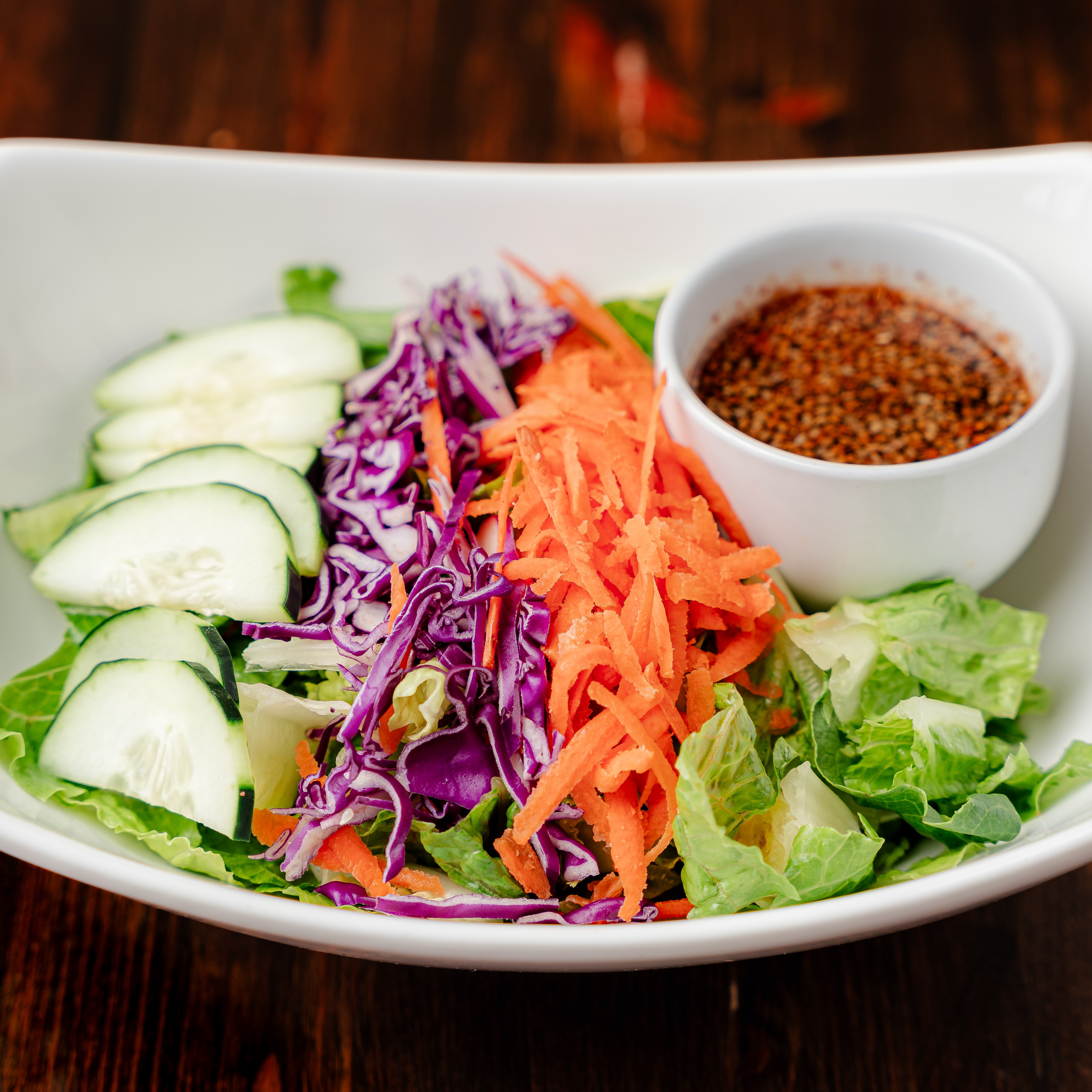 Mix Green Salad, Romaine, Cucumber, Carrots, and Cabbage, Top with Special House Dressing.