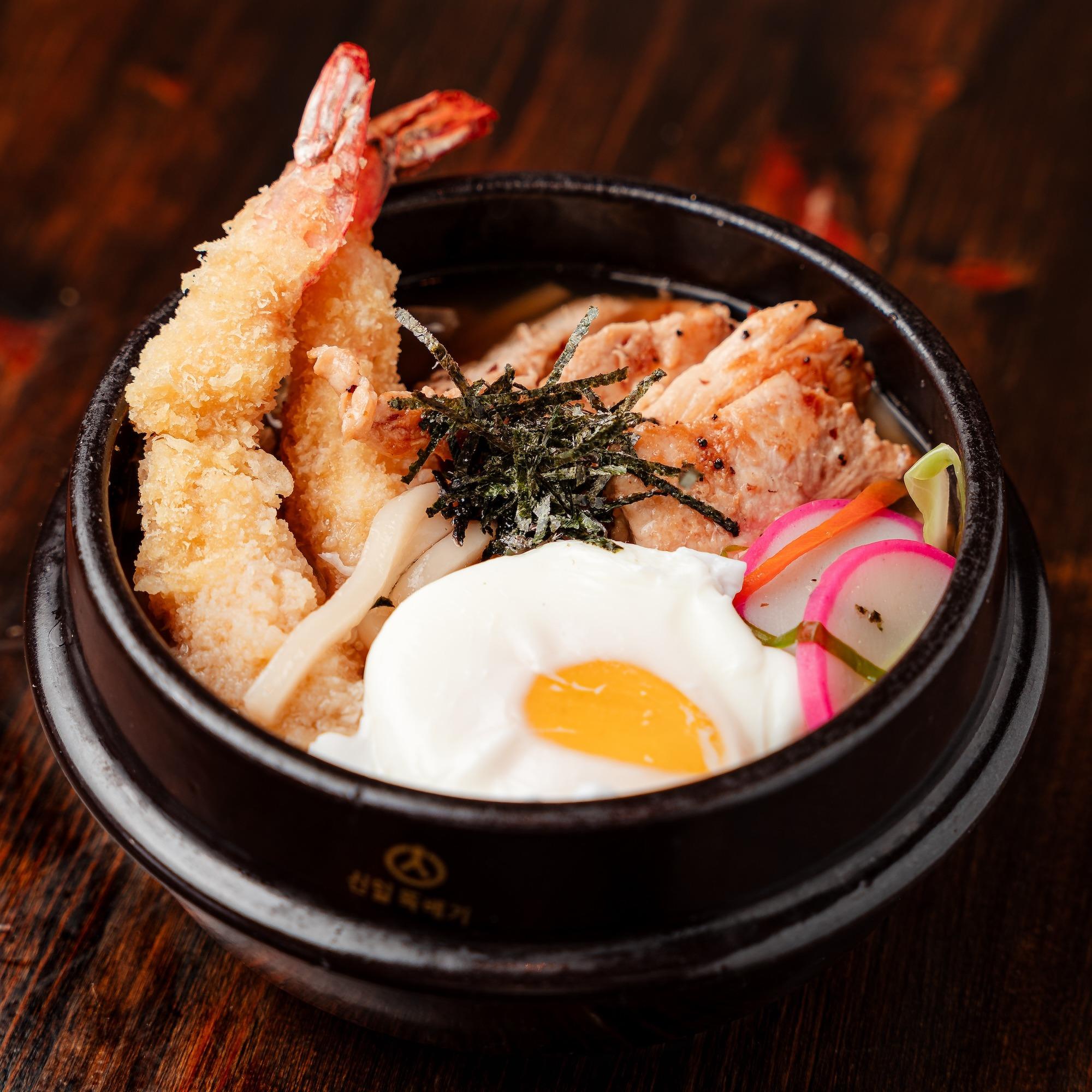 Udon, shrimp tempura, poached egg, chicken, onion, carrot, green onion, cabbage.