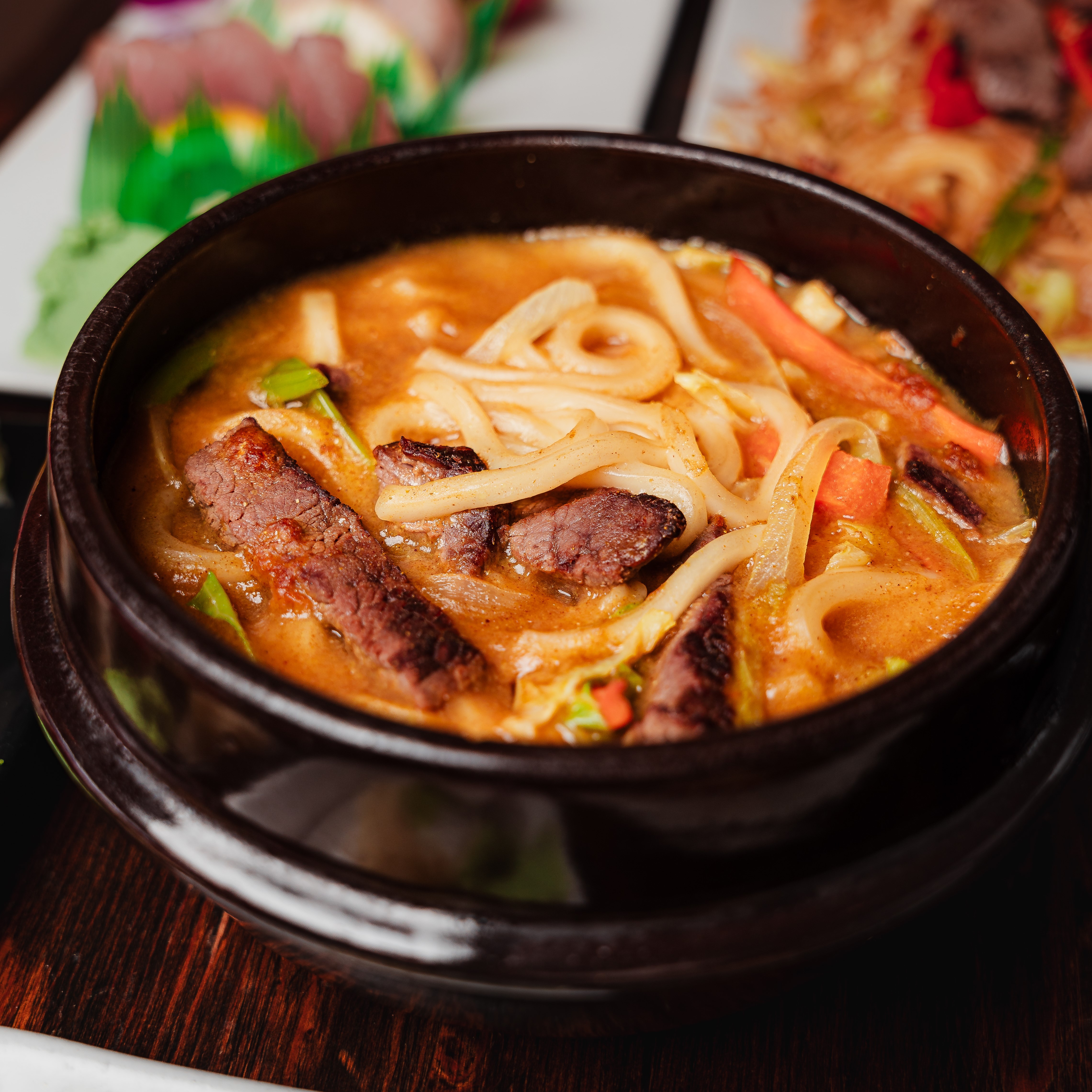 Udon, Curry Base Broth, Beef Slice, and Vegetables (Onion, Green Onion, Cabbage and Carrots)